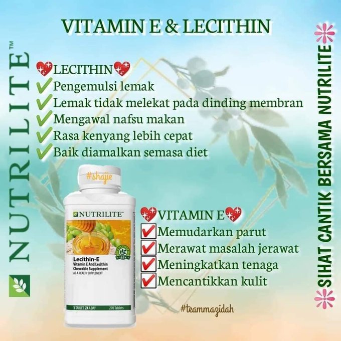 Satu tablet yang boleh dikunyah mengandungi 25 IU Vitamin E dan 50 mg Lesitin. Apakah kebaikan Lecithin E Green-T Plus Tablet dan CB Plus. The cheapest Amway Nutrilite Lecithin-E price in Malaysia is RM 6800 from Shopee.
